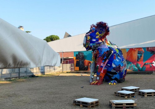 Un koala alto 6m realizzato con i pezzi di bagni mobili Sebach dismessi rappresenta il bisogno di pa...