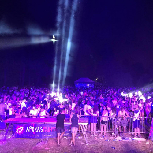Il festival musicale all’aperto che si è tenuto all’Apokas Paintball Park di Merate (Lecco) sorprende e supera le aspettative, con effetti super speciali, spettacoli di luci e laser, i mitici Ghostbusters APK e un gigantesco carro armato autentico modificato per sparare polveri colorate fluorescenti a tempo di musica sul pubblico scatenato.